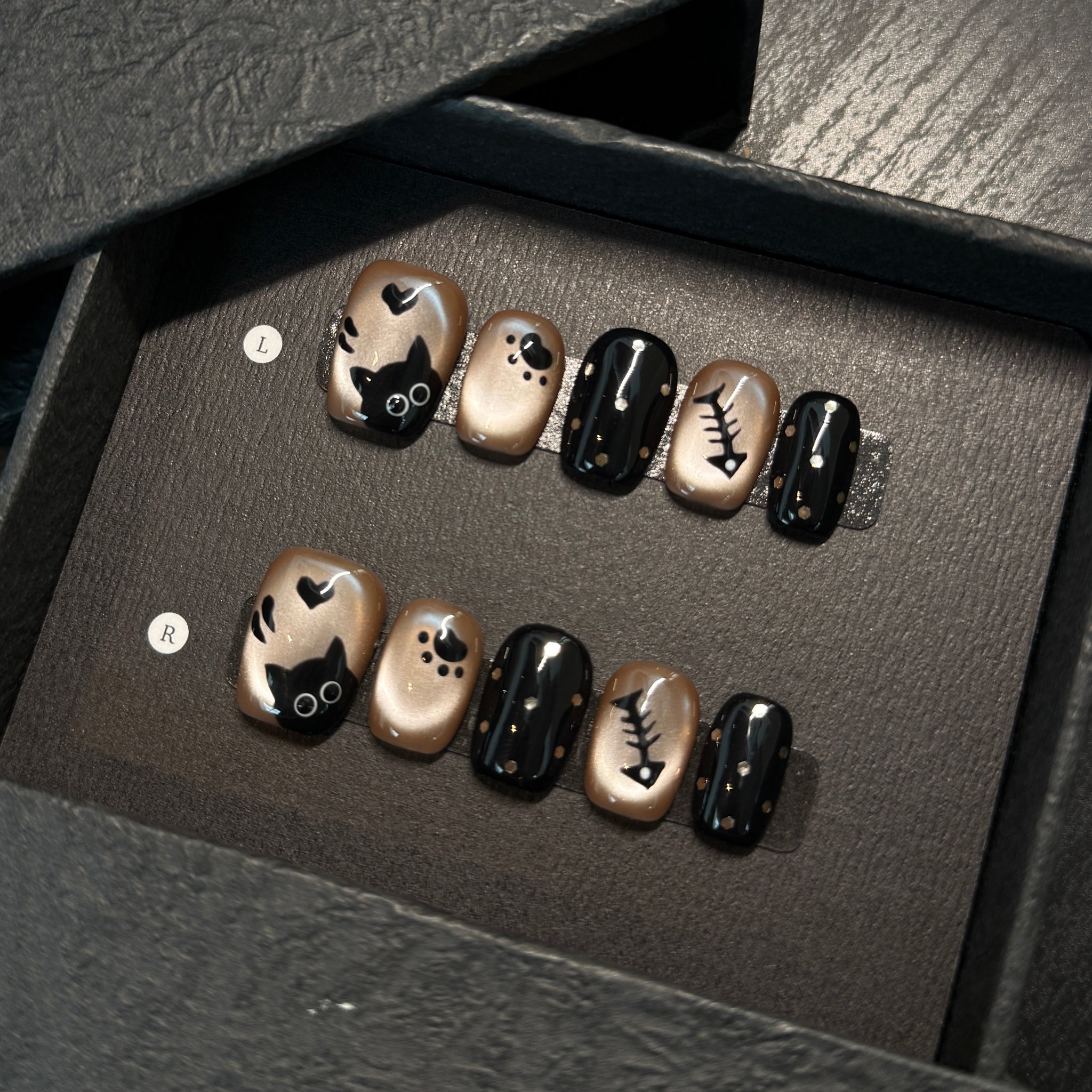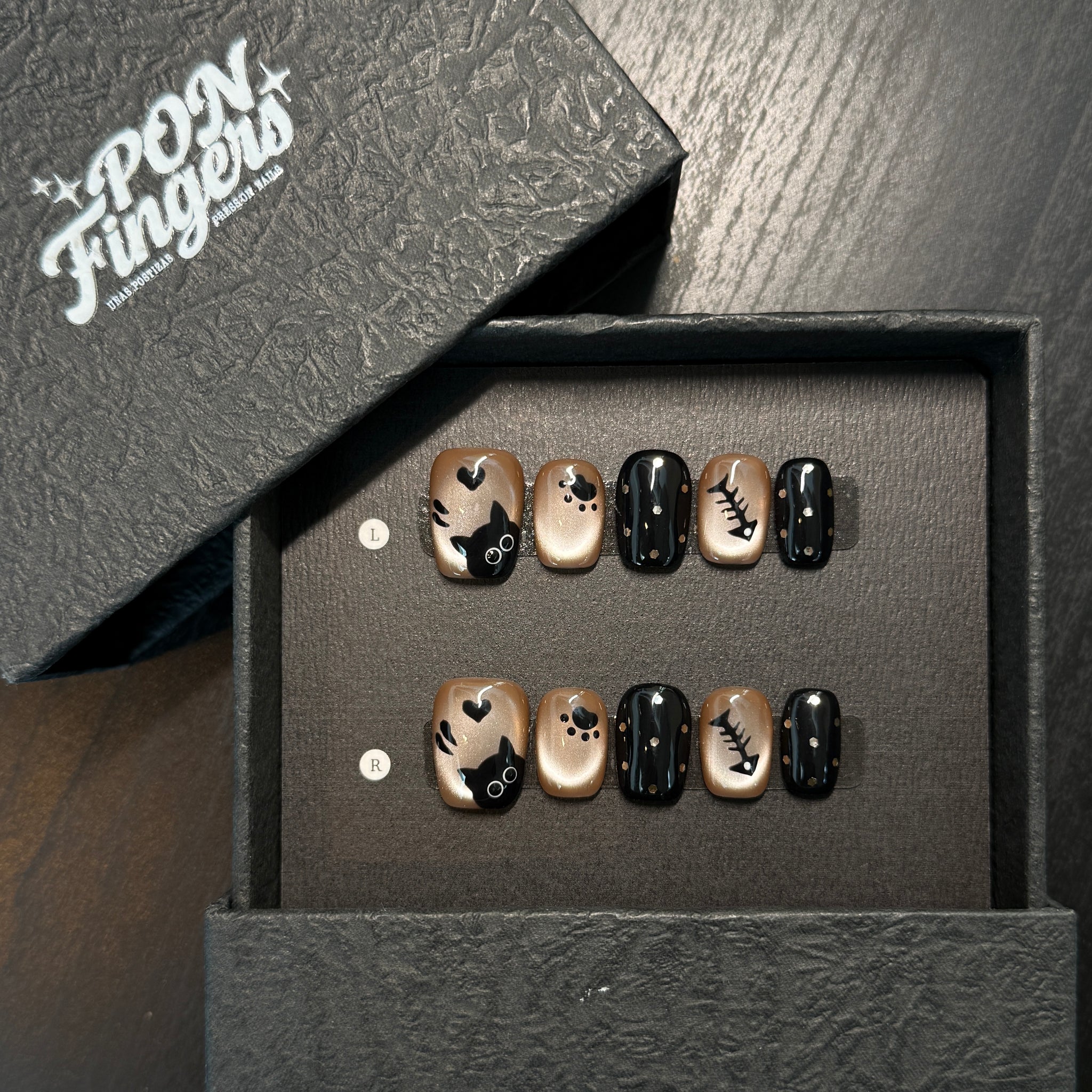 La combinación de colores oscuros con el brillo hipnótico crea un look misterioso, mientras que los detalles felinos convierten este set en un verdadero must-have para amantes de los gatos.