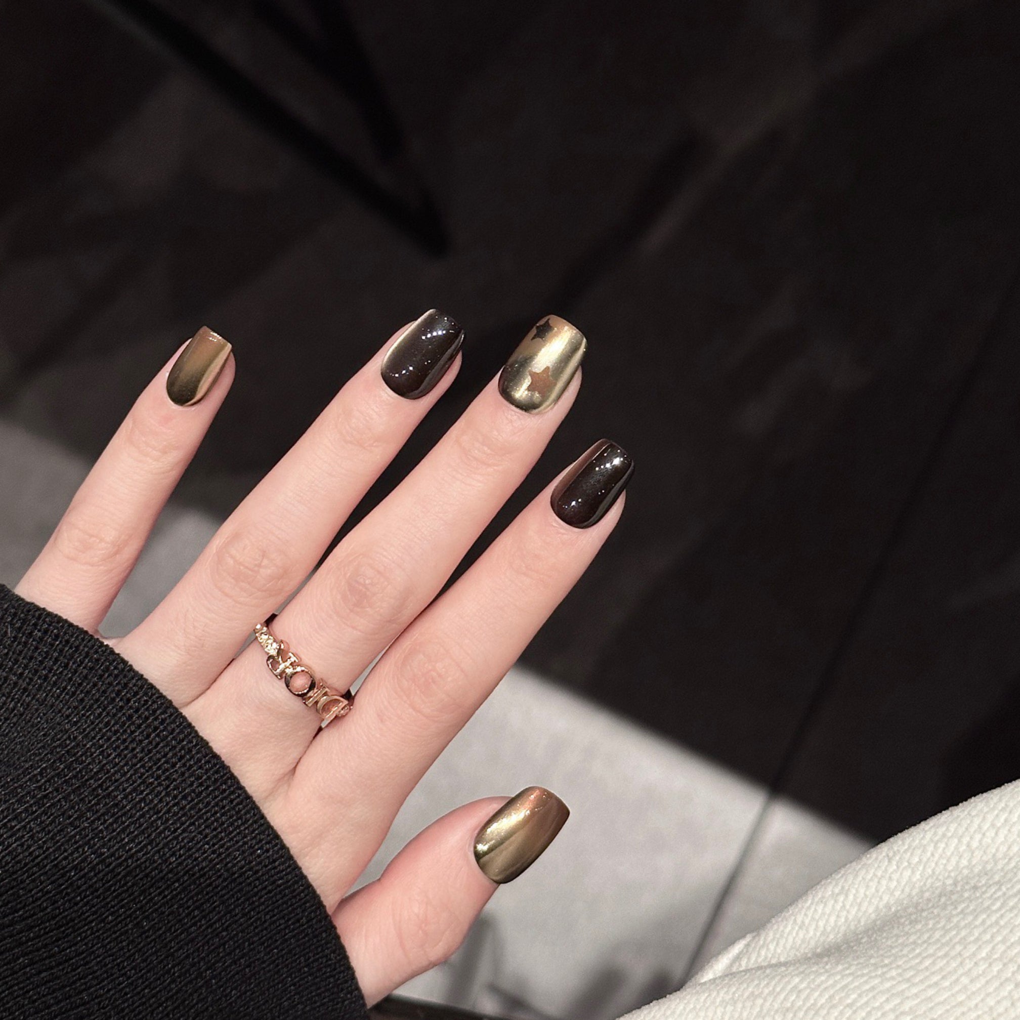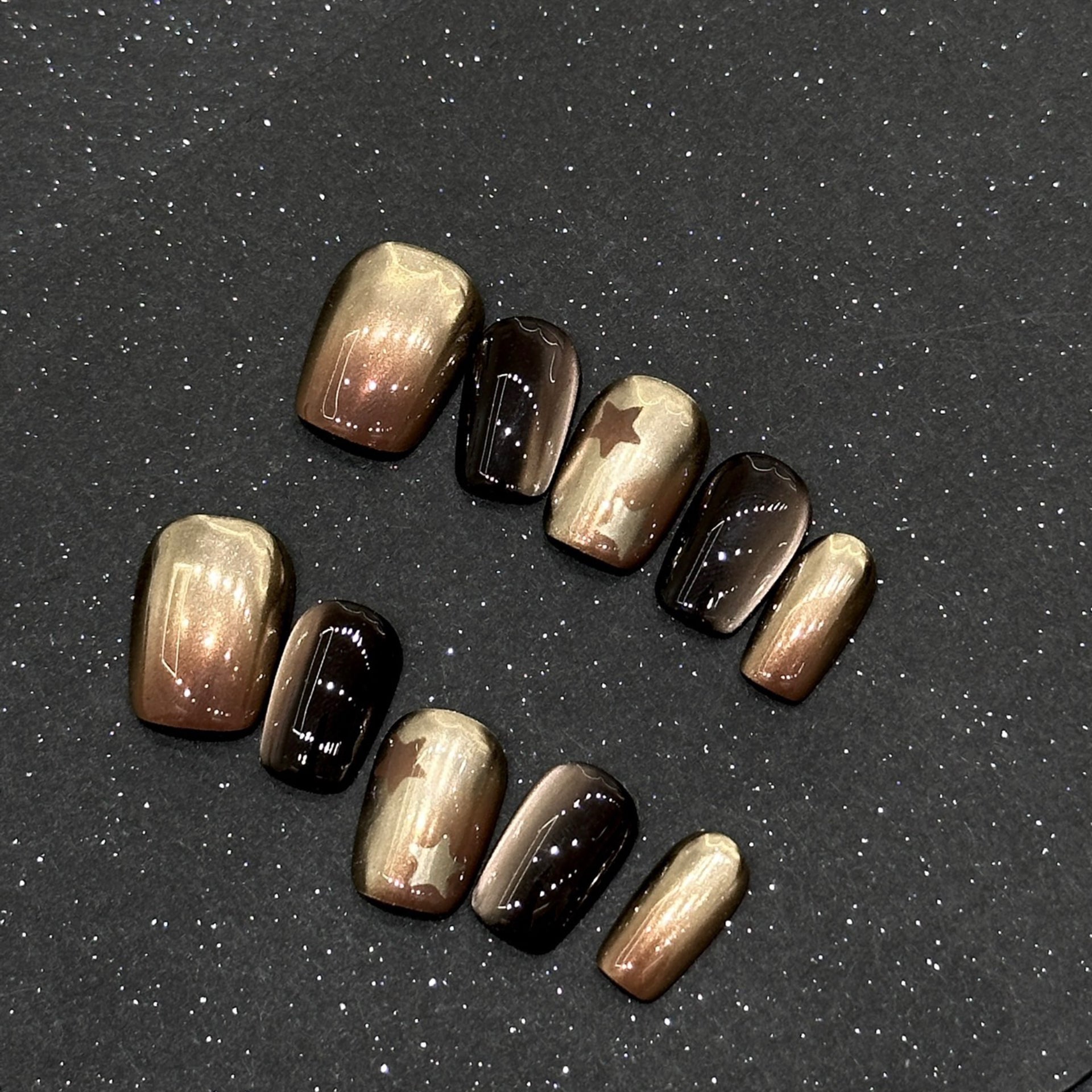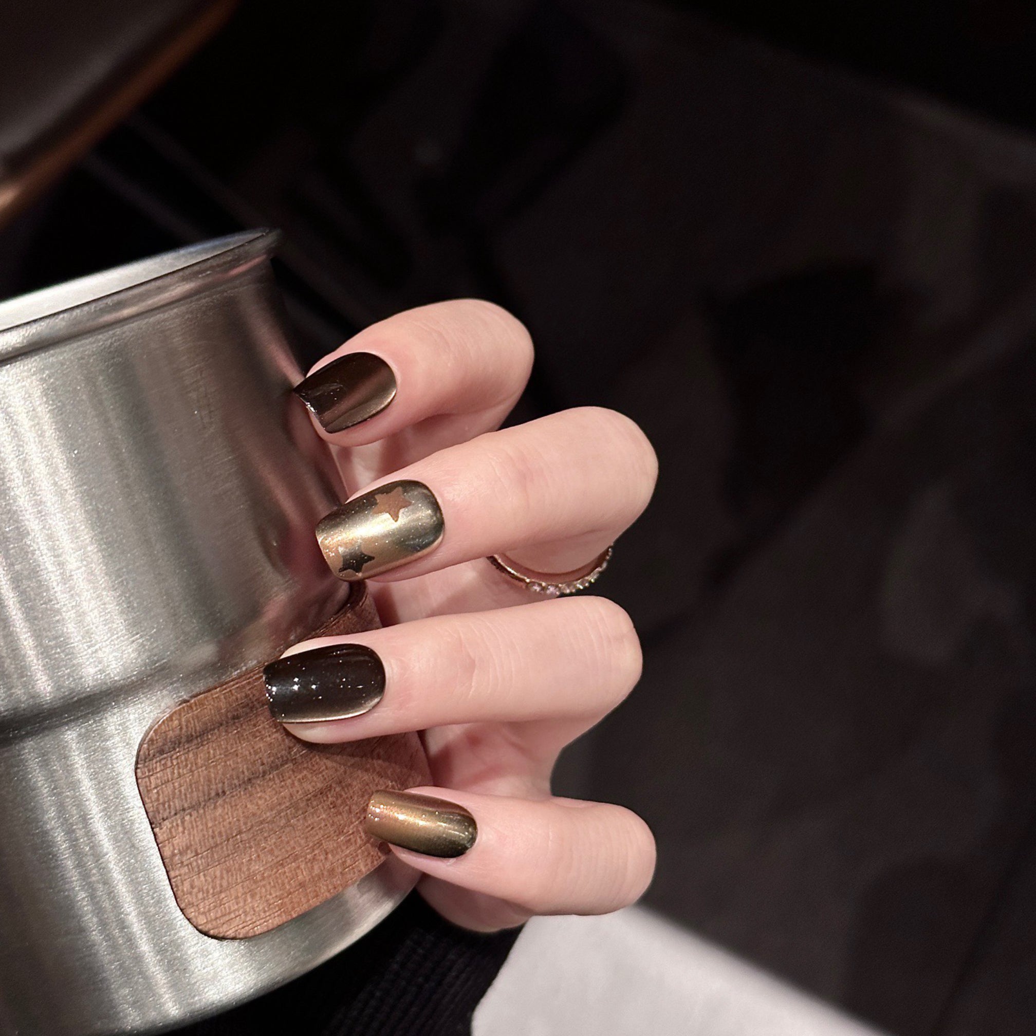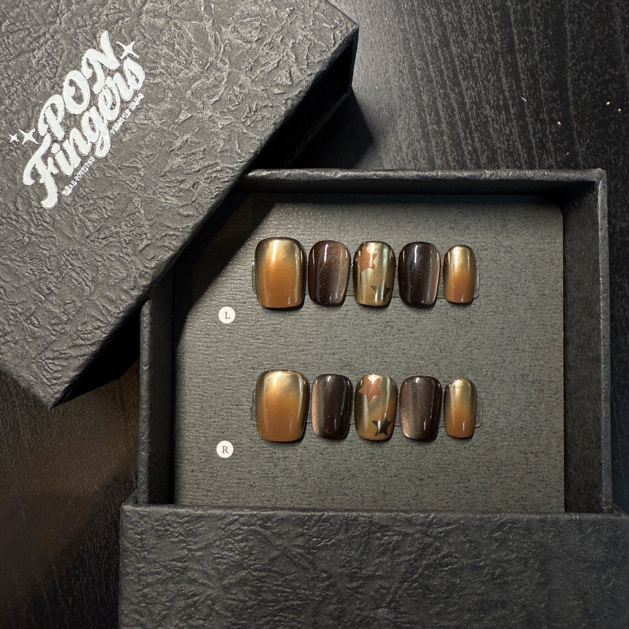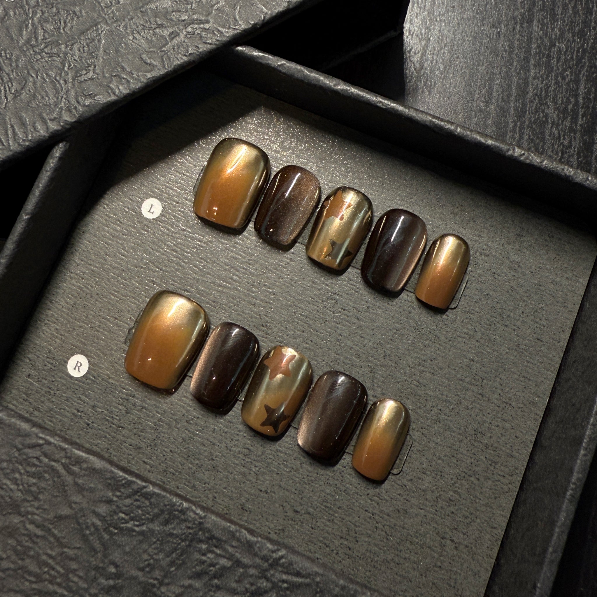 Un diseño cálido y acogedor en tono marrón café, decorado con pequeñas estrellitas en algunas uñas que aportan un toque divertido y delicado. Ideal para quienes buscan un look elegante, moderno y con un detalle encantador que destaque.